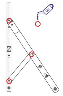 Glidebeslag og beslag til vendbare vinduer smøres i alle ledforbindelser under gentagen aktivering, således at smøremidlet vandrer ind mellem de indbyrdes bevægelige arme. Der smøres både udvendigt på ledforbindelserne, og i spalteåbningen mellem armene. Til dette anvendes en let indtrængende syrefri olie efterfulgt af en langtidsvarende syrefri fedt på spraybasis. Der smøres efter behov, dog min. 1 gang årligt.