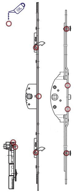 Paskviler og lignende smøres med syrefri olie eller syrefri fedt på spray-basis i låsekassen samt ved rullerne, tapperne eller kolverne under gentagen aktivering. Der smøres efter behov, dog min. 1 gang årligt.